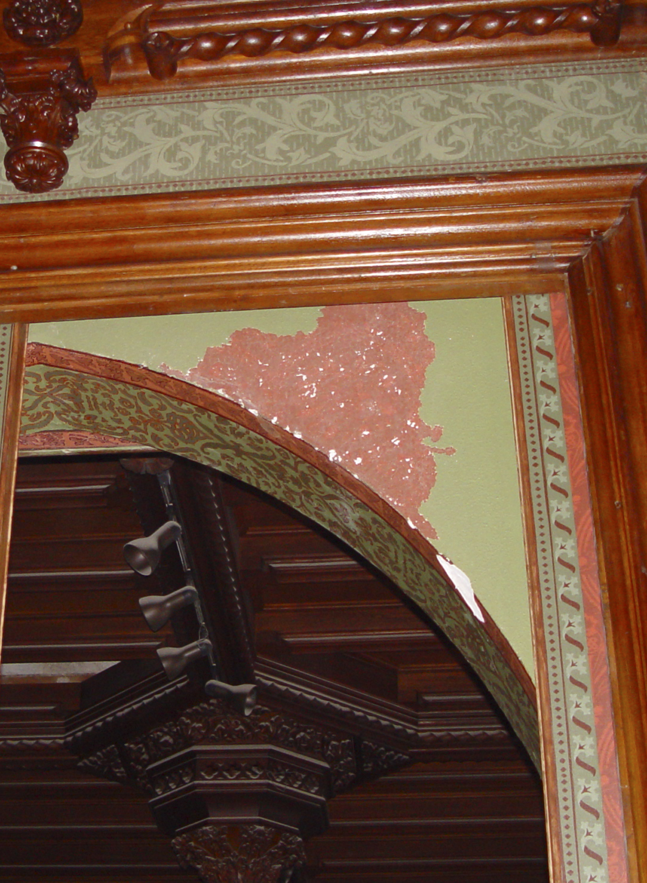Der Festsaal auf Schloß Drachenburg, Königswinter ist auf zwei Seiten durch 4,30 hohe Schiebetüren zugänglich. Die farbige Dekoration der Türen war im Lauf der Zeit mehrfach überlackiert und gespachtelt worden. Bei den vom Saal wegweisenden Flächen war eine Freilegung möglich.