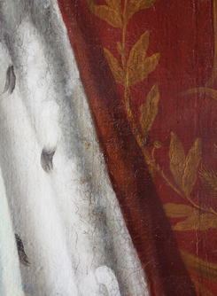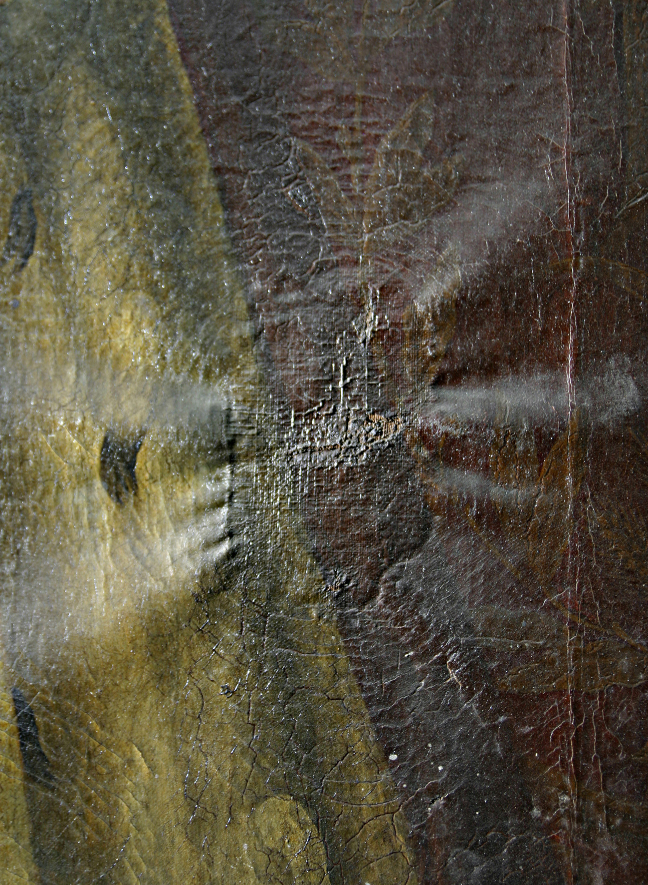 Risse und Löcher wurden mit verschiedensten Gewebeflicken in mehreren Restaurierungsphasen hinterklebt. Zwei Flicken waren sehr naß mit heißem Glutinleim aufgeklebt. Durch die hohe Feuchtigkeit schrumpfte das Gewebe unter dem Flicken und verursachte Runzeln und Blasenbildung in der Bildschicht.